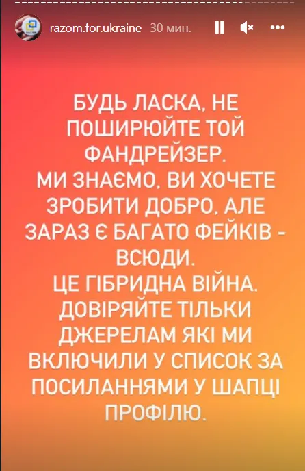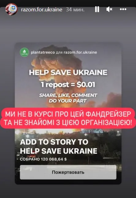 Организация razom.for.ukraine заявила, что не знакома с фондом Plantatreeco и призывала не распространять подобные призывы, а донейтить только официальным фондам.