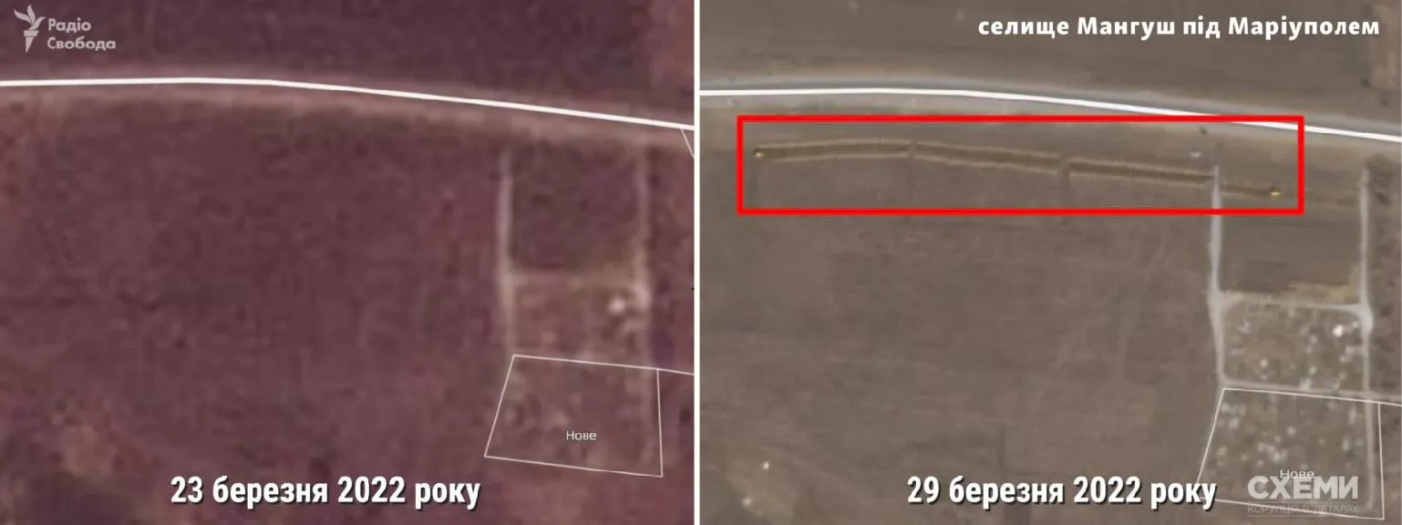 Журналисты "Схем" получили спутниковые снимки из Мангуша, в 20 километрах от Мариуполя, на которых вырыта траншея. Вероятно, это место массового захоронения людей.