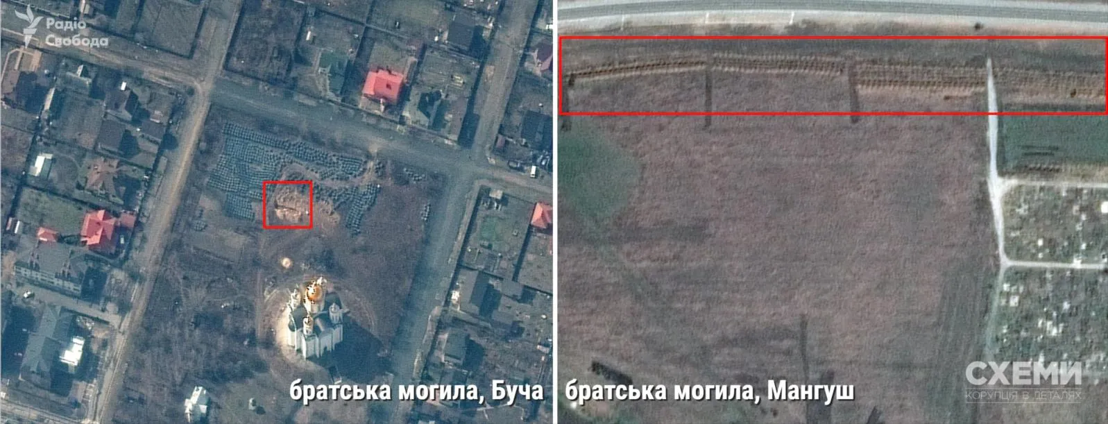 Сравнение братской могилы в Буче и снимка в Мангуше / Фото "Схемы"