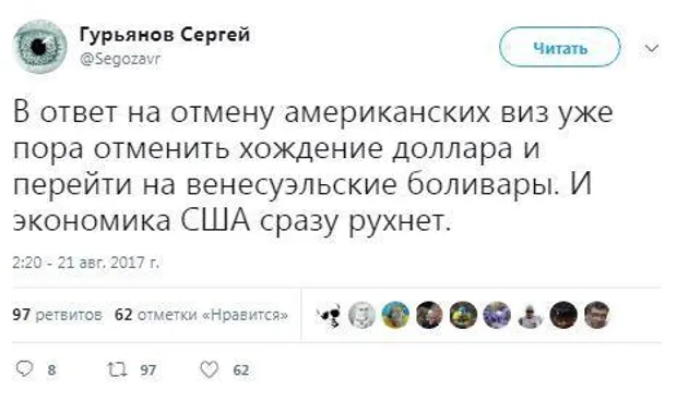 Событие стремительно получило огласку в социальных сетях. Каждый из пользователей по-своему отреагировал на новость. В частности, Устим Антирашкин заявил, что Россия – это "высокодуховная страна, где все наиболее "передовое" и усовершенствованное ... Зачем им ехать в "загнивающий" запад". А Гурьянов Сергей отметил, что Кремлю следует отказаться от доллара и перейти на венесуэльскую валюту, тогда "экономика США сразу разрушится".