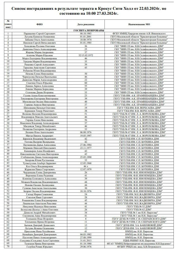По последним данным, сейчас в больницах после теракта в "Крокусе" остаются 83 пострадавших, Минздрав Подмосковья опубликовал обновленный список на утро 27 марта.