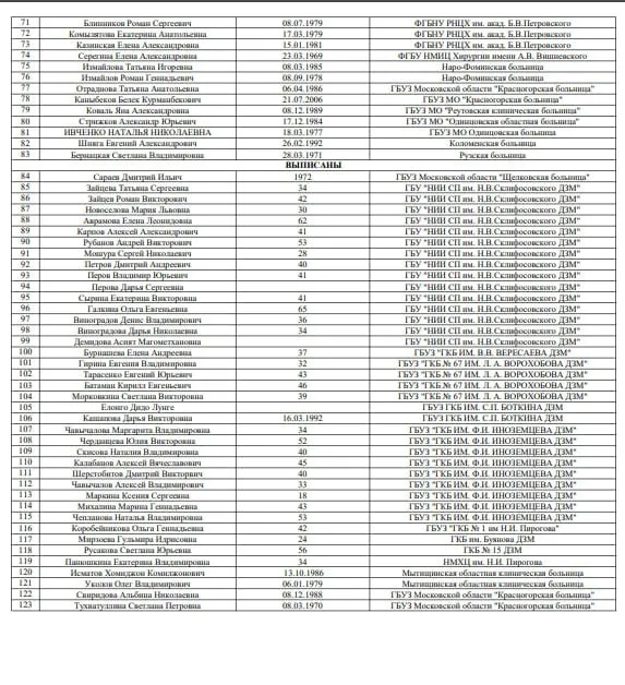 Список россиян, которые остаются в больницах после теракта / Фото из российских телеграм-каналов