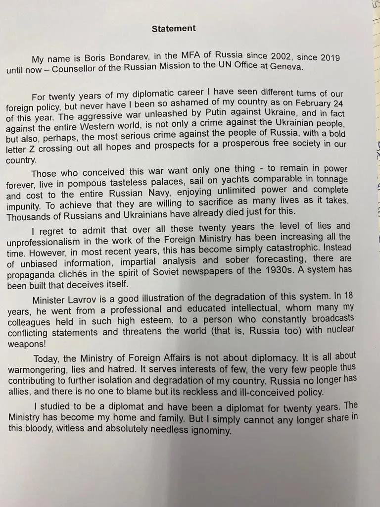 В ООН призвали всех остальных российских дипломатов в Организации Объединенных Наций и во всем мире следовать нравственному примеру Бондарева и уйти в отставку.