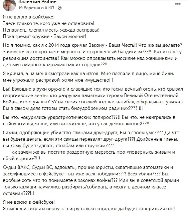 Причиной жалобы стало сообщение рыбина в фейсбуке, которое, как написал Фортуненко, содержит: