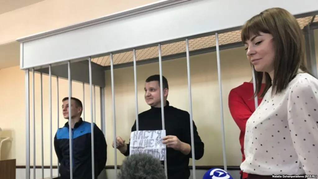 Украинский пленный моряк Андрей Шевченко с плакатом в зале суда// "Радио Свобода"