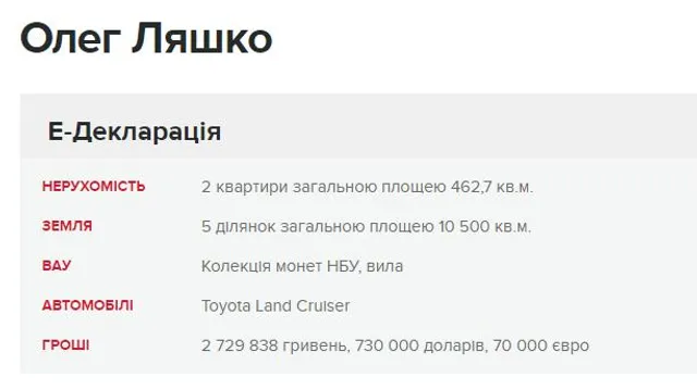 Согласно информации о доходах, полученных от налоговых агентов за 1998-2015 годы, выплаченный доход Ляшко составил 3,3 миллиона гривен, а уплачено налогов – 398 300 гривен.
