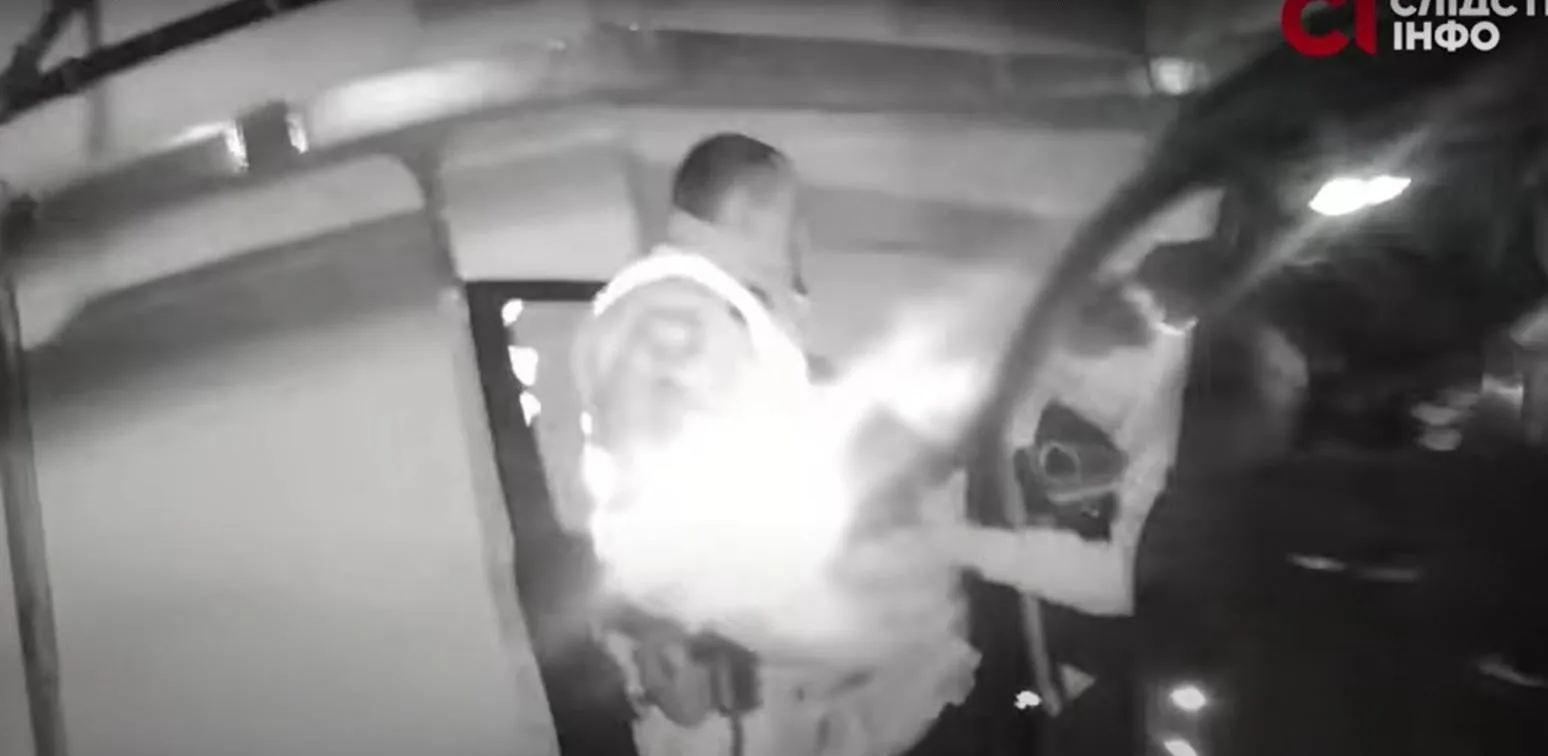 На фото стопка-кадр из видео бодикамеры полицейского, где видно как Бабенко, который "не управлял авто", фактически выпадает из-за руля и еле стоит на ногах,