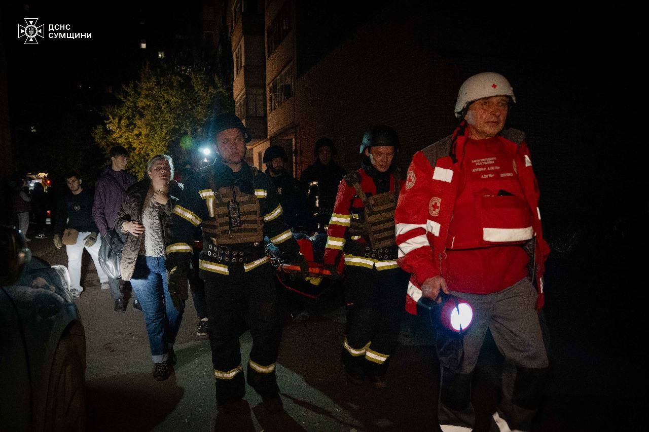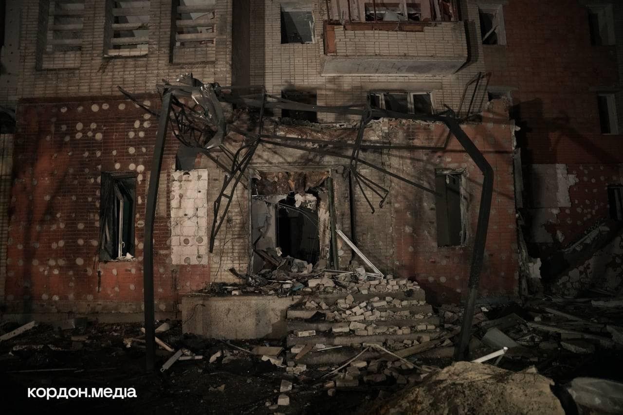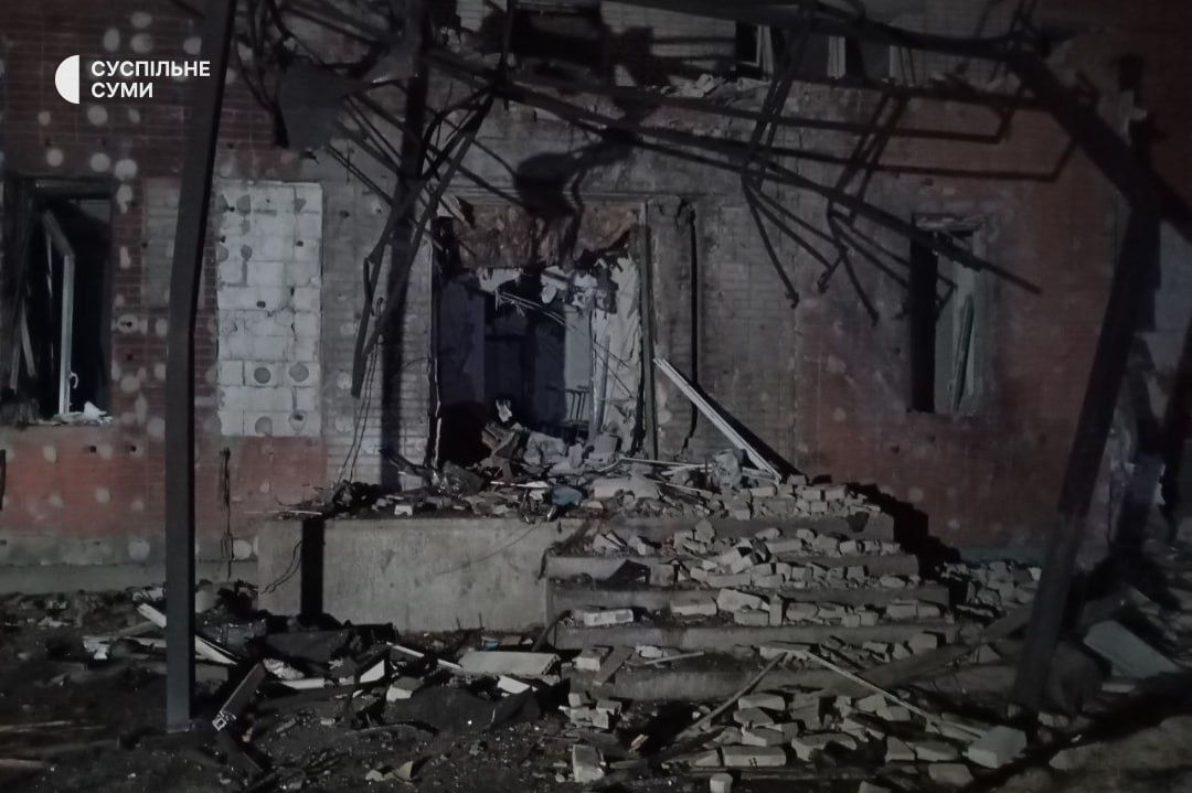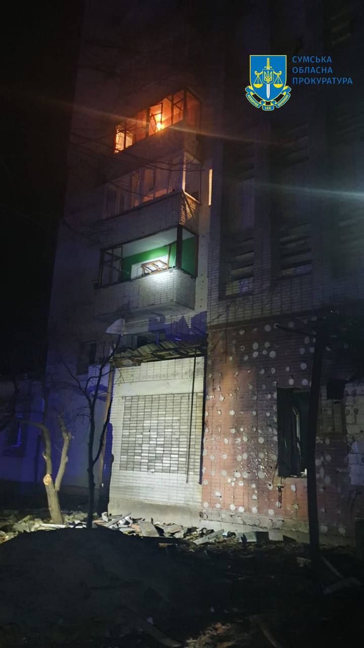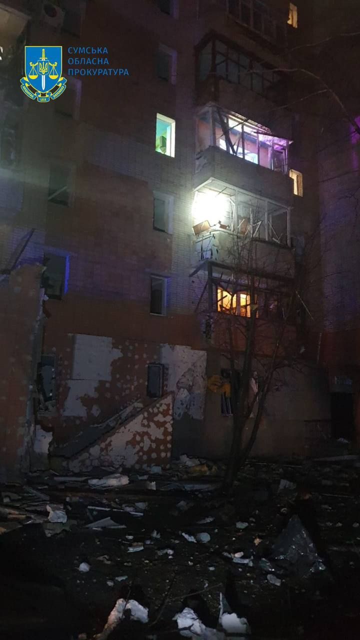 Исполняющий обязанности Сумского городского головы Артем Кобзарь сообщил, что в результате удара "Шахедом" были повреждены окна в одной из многоэтажек. Впоследствии стало известно о попадании в само здание. По словам чиновника, в многоэтажке практически все этажи были разрушены.