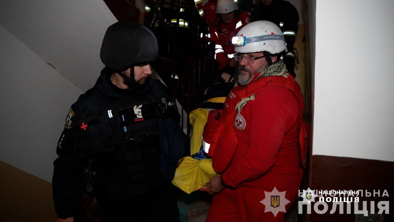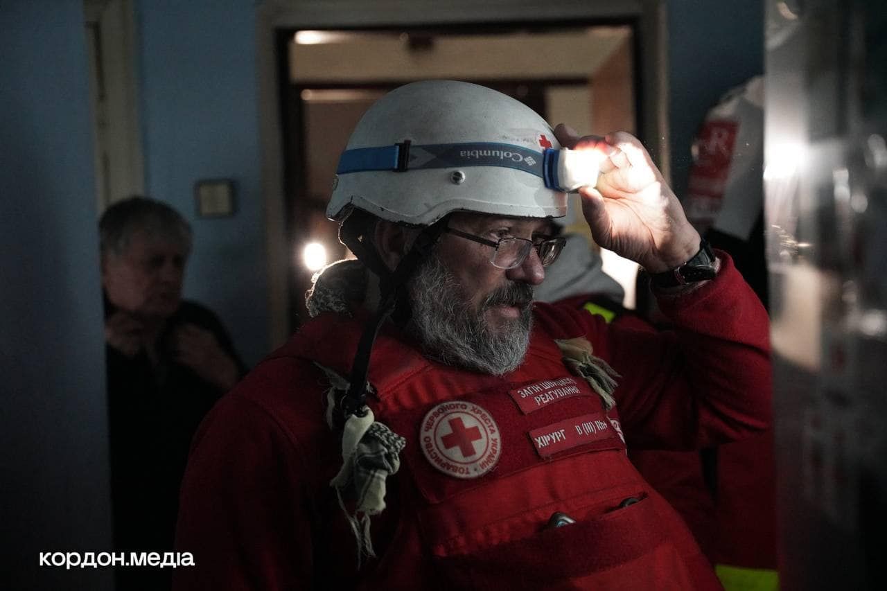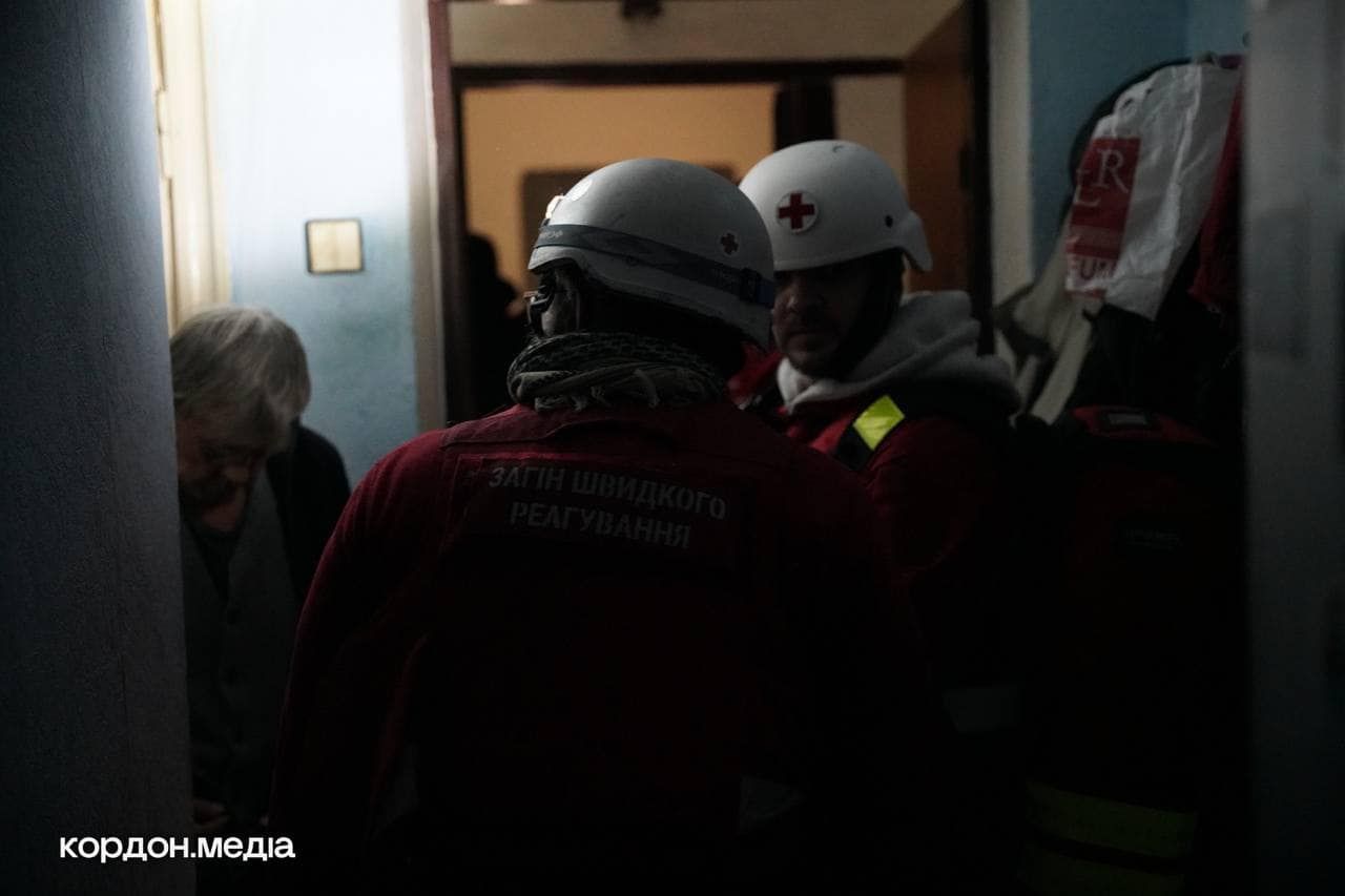 Также журналисты показали, как с верхнего этажа многоэтажки эвакуируют пожилую женщину. Ее вынесли спасатели и волонтеры Красного Креста.