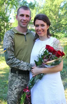 Пресс-группа штаба АТО случайно наткнулась на молодоженов. Александр и Василиса. Он – водитель санитарного автомобиля механизированной бригады, она – медсестра в составе мобильного госпиталя.