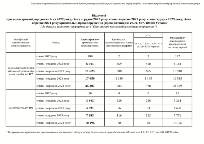 Согласно ответу Офиса генерального прокурора на запрос журналистов, с января 2022 по сентябрь 2024 года было зарегистрировано 59 606 уголовных производств за самовольное оставление воинской части или места службы, из которых 2 592 дела закрыты.