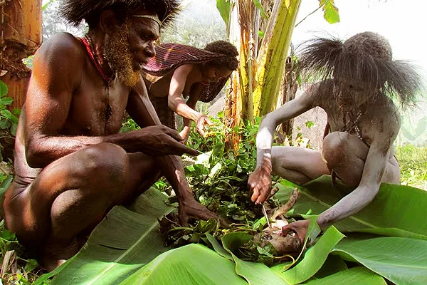 Печена чи то парена по-папуаськи свинина на смак щонайменше дивна. Маленького шматочка для дегустації було достатньо, щоб зрозуміти, що м’ясо, на яке ми стільки чекали, — напівсире.