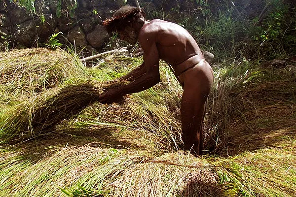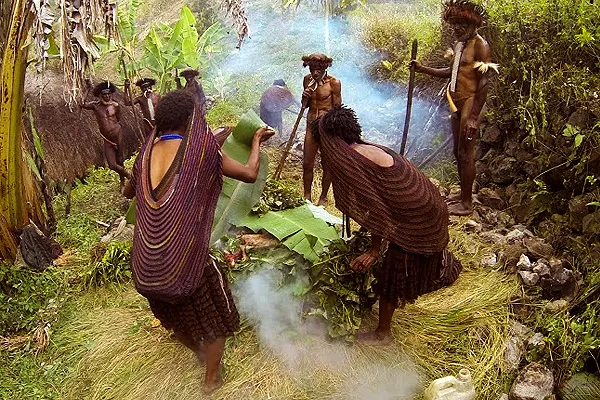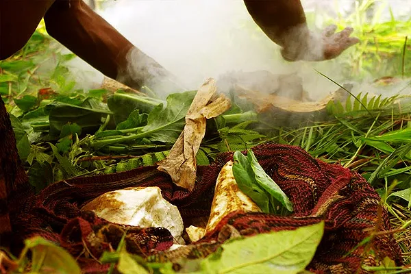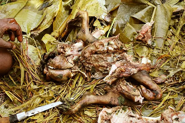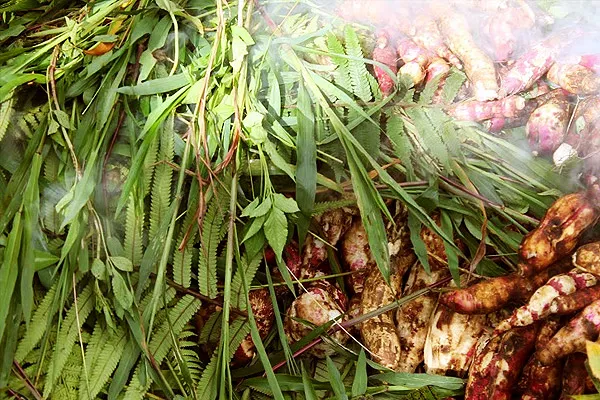 Їжу готують древнім способом у земляній печі. Для цього яму, завглибшки близько півметра, ретельно викладають сіном, травою та щедро поливають водою.
