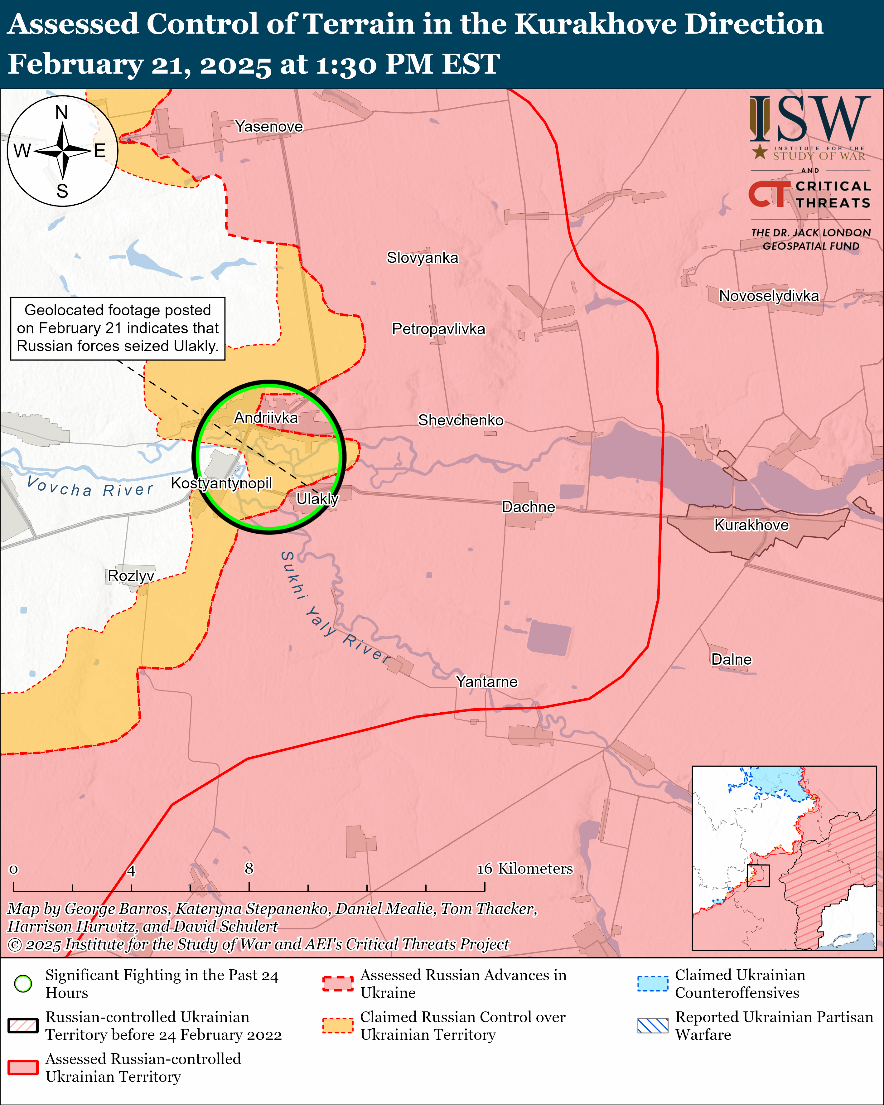 - Российские войска ликвидировали украинский карман к западу от Курахово. Геолокационные кадры, опубликованные 21 февраля, свидетельствуют, что они захватили Улаклы. Под Покровском россияне также продвинулись, это произошло в центре Лысовки.