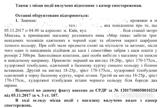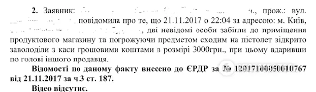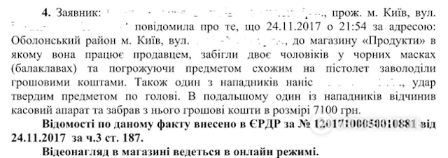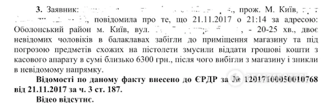 Вечером 21 ноября двое неизвестных напали на продуктовый магазин в Оболонском районе и, угрожая предметом, похожим на пистолет, забрали из кассы 3 тысячи. В тот же вечер двое неизвестных в балаклавах украли 6300 гривен с еще одного магазина на ул. Героев Днепра.