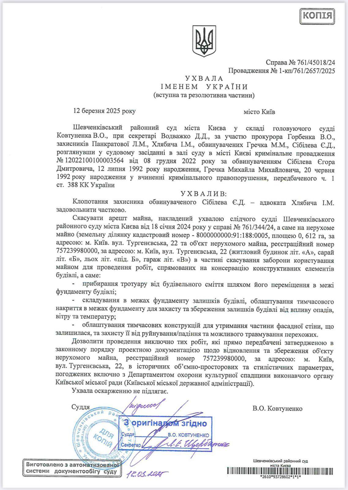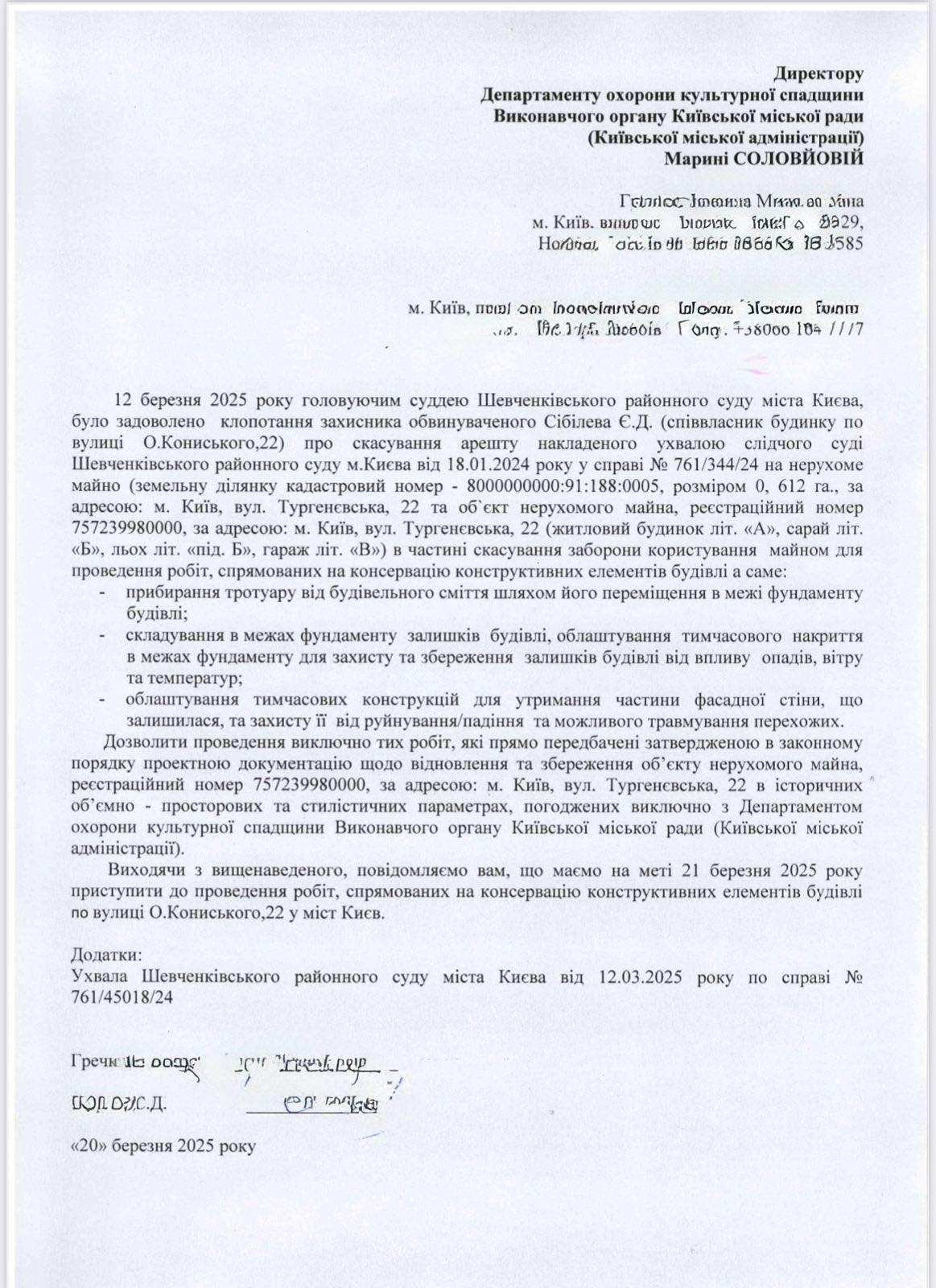 "Департамент охраны культурного наследия сообщает, что 21 марта владельцем были начаты работы на Усадьбе Зеленского, направленные на консервацию остатков усадьбы для защиты от внешнего воздействия и разрушений. По информации владельца здания, 12 марта 2025 Шевченковский районный суд города Киева частично снял запрет на пользование имуществом для проведения работ, направленных на консервацию конструктивных элементов здания. ДОКС отмечает, что любые попытки препятствовать процессу восстановления памятника или манипулировать ситуацией неприемлемы", – говорится в сообщении на сайте КГГА.