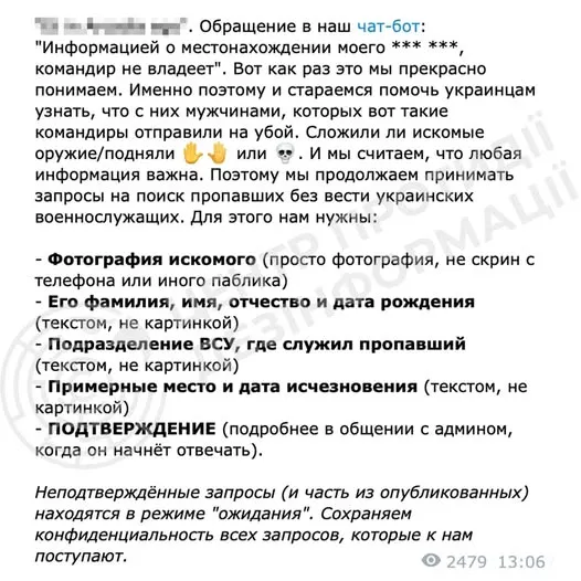 Он собирает информацию от родственников – авторы сообщений просят прислать полные личные данные: ФИО, дату рождения, фото, подразделение, обстоятельства исчезновения и тому подобное.