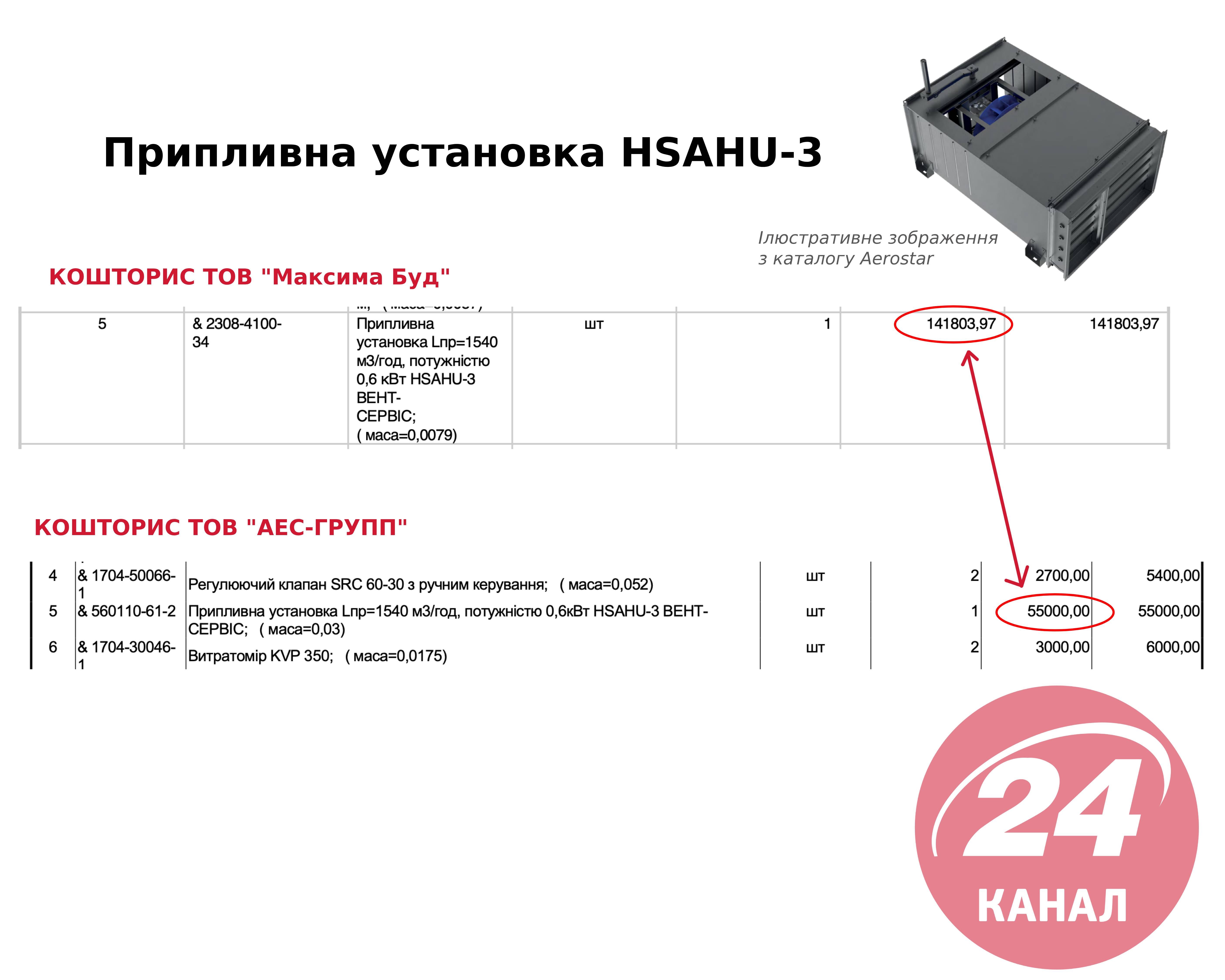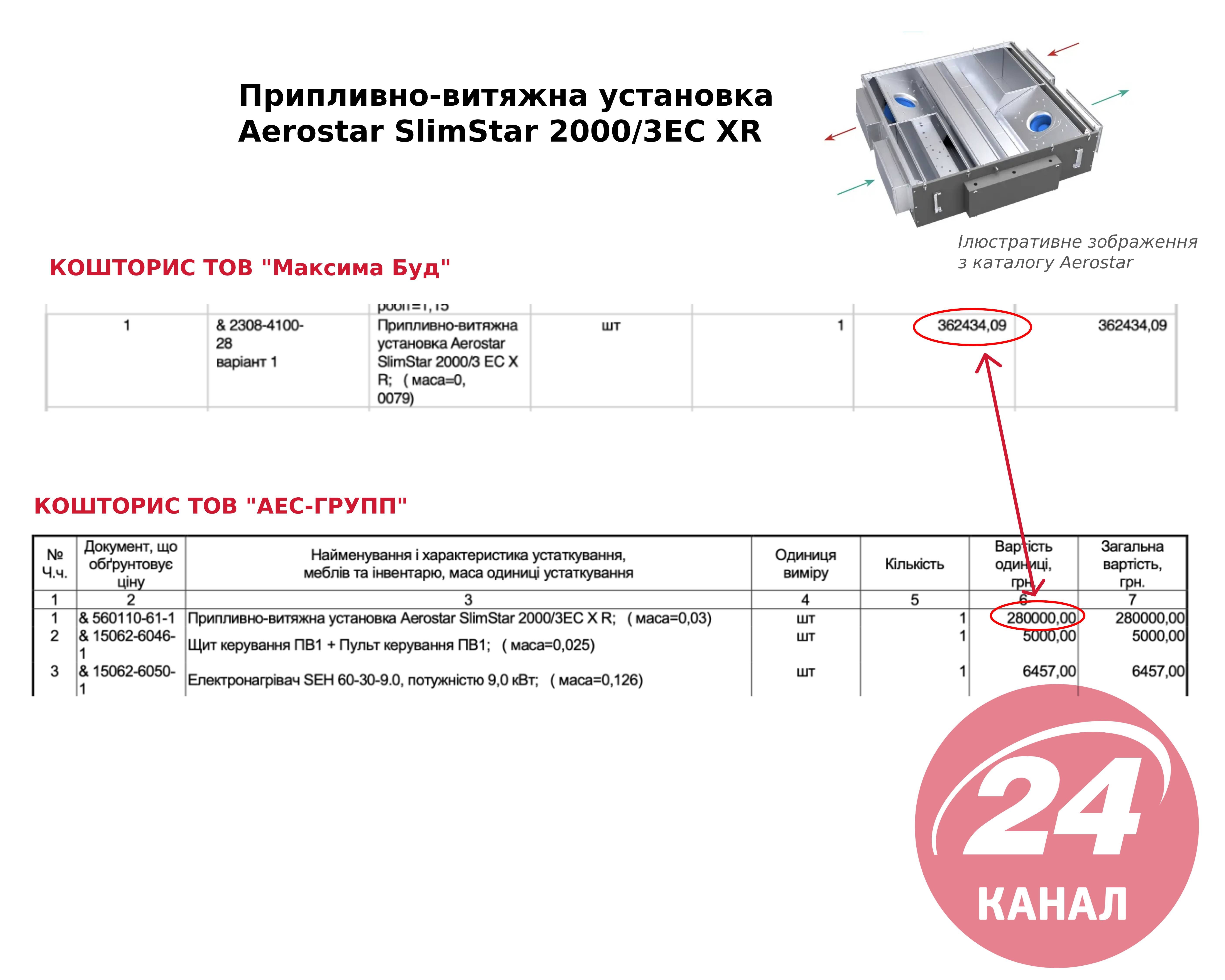 - В своей смете компания "Максима Буд" отметила приточно-вытяжную установку Aerostar SlimStar за 362 тысячи гривен, тогда как отклоненный конкурент – за 280 тысяч гривен. Разница в цене составляет более 20%.