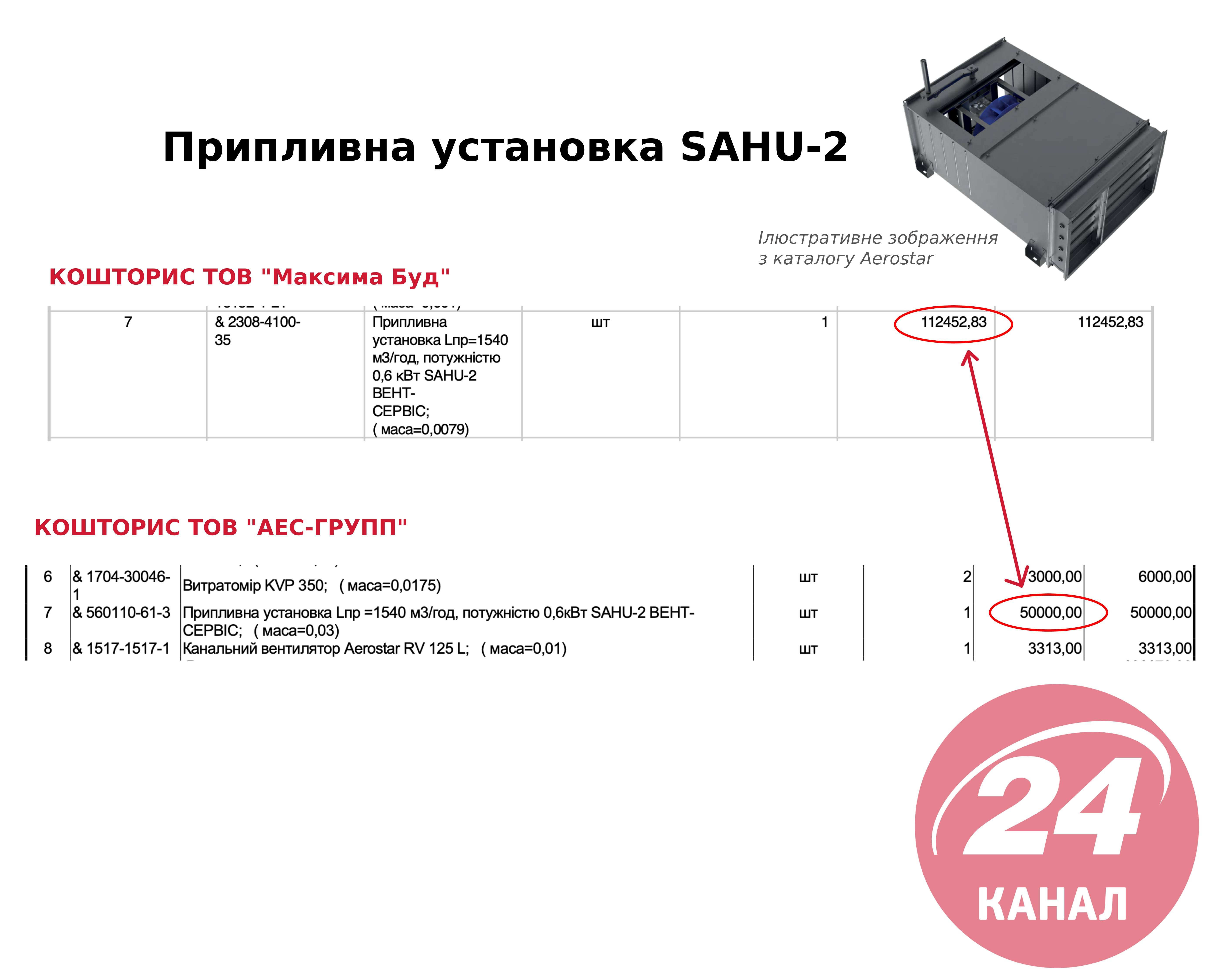 - Приточная установка SAHU-2 в смете "Максима Буд" оценена в 112 тысяч гривен, тогда как конкуренты указали лишь 50 тысяч гривен, что более чем вдвое дешевле.