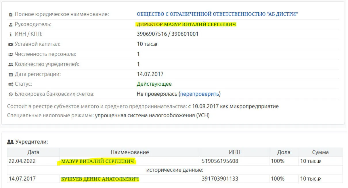 Мазур стал владельцем "АВ Дистри" 22 апреля 2022 года, когда Бушуев передал ему 100% акций компании, а сам стал руководителем той самой сербской компании "HOLBERG".