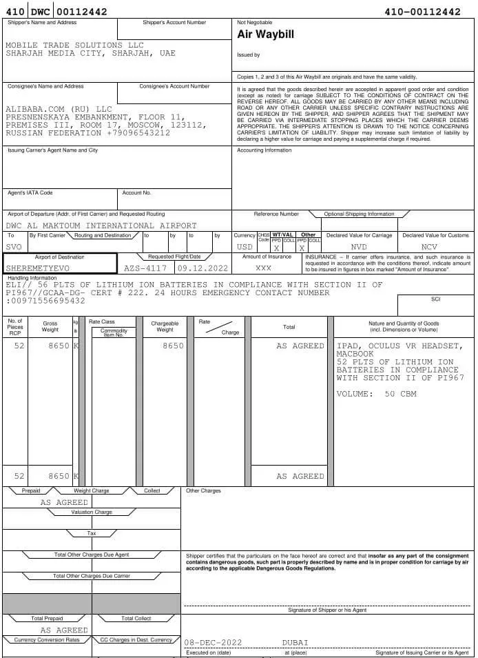 Накладная на перевозку техники из ОАЭ для российской компании / Фото InformNapalm