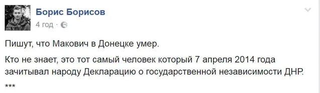 Сторонник сепаратистов Борис Борисов в сообщении о смерти террориста добавил, что именно он зачитывал так называемую "декларацию о независимости "ДНР" в 2014 году. Сепаратисту было 57 лет.