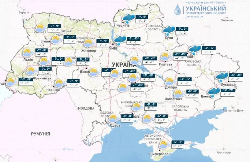 Синоптики прогнозируют ночью 10 января -7...-9 градусов на Западе, -13...-15 в Черкассах, Полтаве, Днепре, Кропивницком, Харькове, -8 на Севере и Юге Украины, а на Востоке -12...-14 в Луганской области и -15...-17 в Донецкой области. Что интересно, в Ужгороде прогнозируют -10...-12 градусов ночью, а днем +2 – так тепло будет только там и в Симферополе.