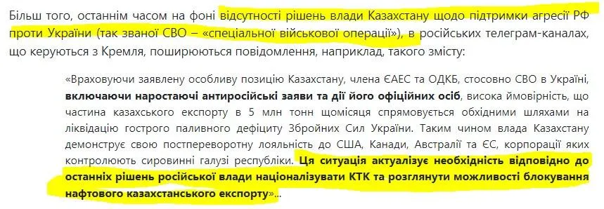Следовательно, Россия пытается экстренными мерами немедленно указать Казахстану его стойло в российской конюшне. Меры экстраординарные. Это 2/3 нефтяного экспорта Казахстана. Конечно, казахи постараются немедленно искать альтернативные пути. На Каспии они столкнутся с той же РФ...
