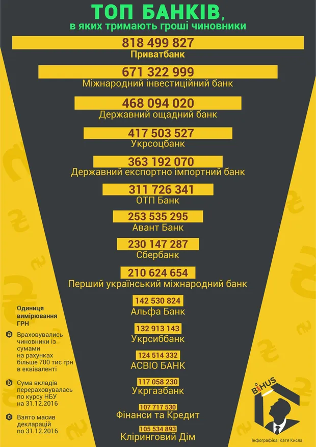 Несмотря на ситуацию в стране, восьмое место занимает российский "Сбербанк", где украинские чиновники хранят около 230 миллионв гривен в эквиваленте. Сразу за ним – "Первый украинский международный банк" (ПУМБ) из корпорации олигарха Рината Ахметова.