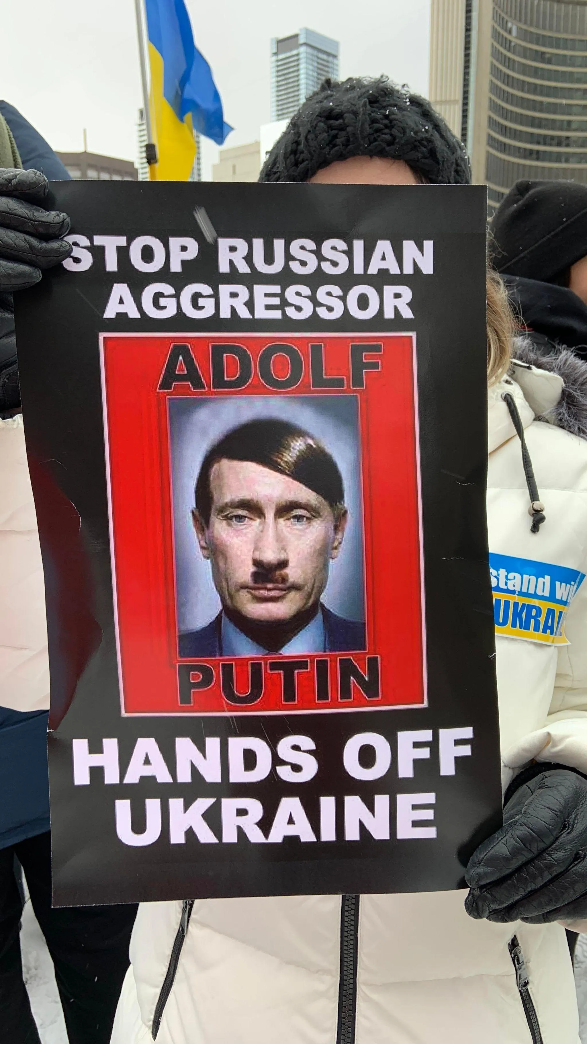 На плакатах встречаются надписи как на английском, так и на украинском языках. В них – слова поддержки Украине и осуждения Путина. На митинг в Торонто вышли тысячи людей, вся площадь перекрыта.