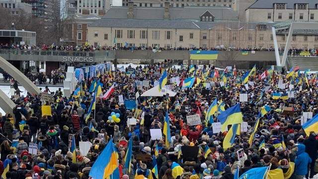 24 канал из собственных источников узнал, что люди выходят на улицы в Торонто с украинскими флагами и антироссийскими плакатами. А в своих лозунгах они требуют Россию остановиться.