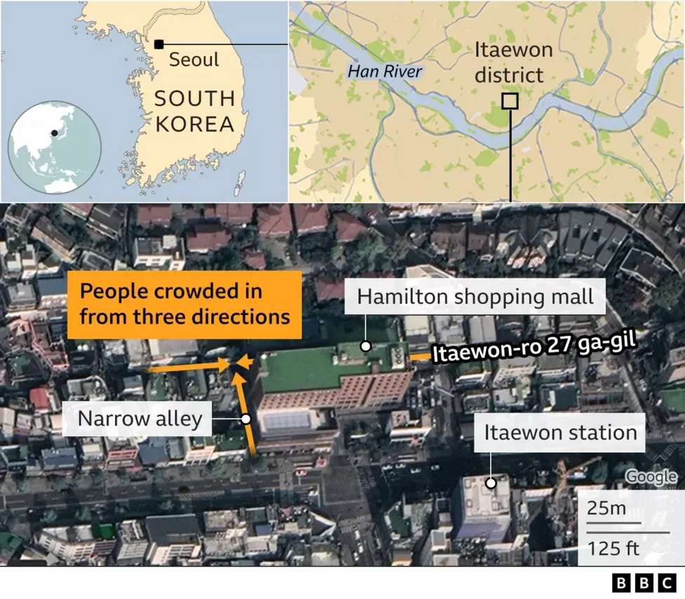 Южная Корея сегодня охвачена трауром по погибшим молодым людям. Сегодня переулок Итхэвон закрыт желтыми лентами. Местный бизнес не открывается, хотя и имеет такую возможность. Люди в отчаянии. Родственники умерших приносят цветы и записки.