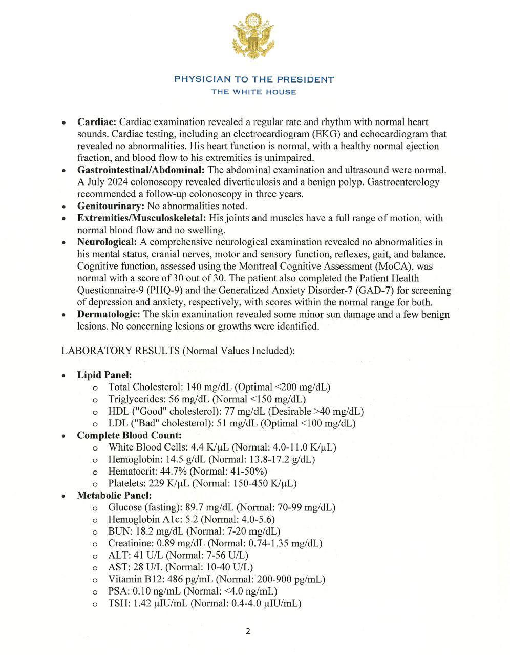 Так известно, что показатели сердечно-сосудистой, дыхательной, неврологической и других ключевых систем организма Трампа соответствуют норме. Он также имеет хорошую для своего возраста память и реакцию. По результатам специализированных тестов было установлено, что уровень тревожности и признаков депрессии у Трампа низкий.