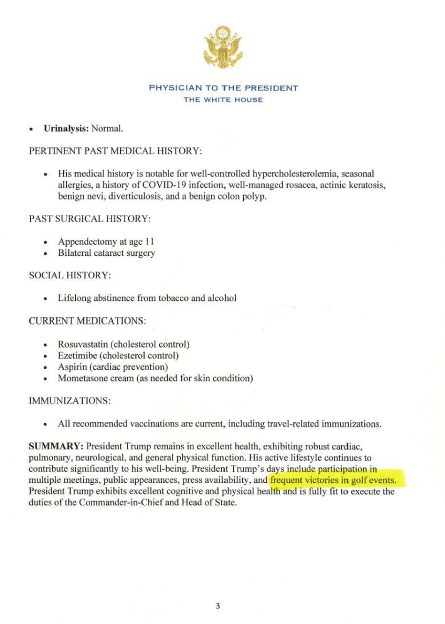 Врач подтвердил, что Дональд Трамп не имеет каких-либо признаков заболеваний, которые могли бы повлиять на его повседневную активность. К тому же Барбелла подтвердил хорошее состояние здоровья его "частые победы в соревнованиях по гольфу".