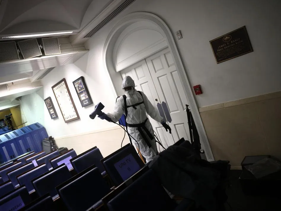 В отличие от персонала, который должен работать ежедневно, политическая команда наоборот, пытается всеми возможными путями не ходить на работу. Те, кто там еще есть, описывают главное здание США как пустое, где ходят люди в защитных костюмах, постоянно все дезинфицируют.