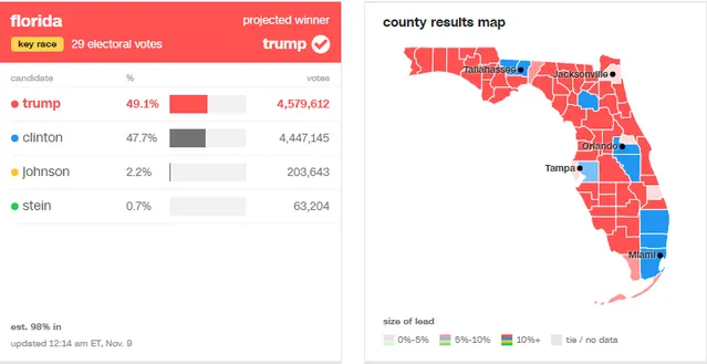 CNN сообщает, что по данным с 98% участков Трамп набрал 49,1% голосов, а Клинтон только – 47,7%.