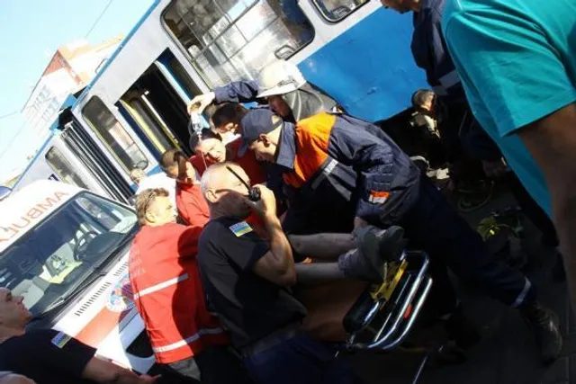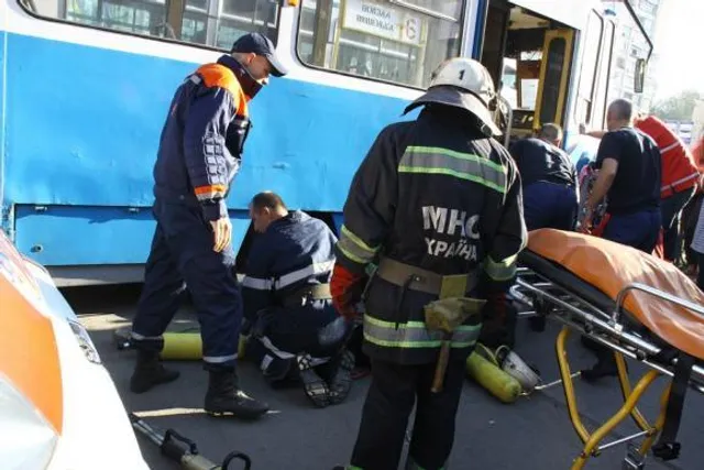 Парень вовремя не среагировал и трамвай его сбил, зажав между кабиной водителя и землей.