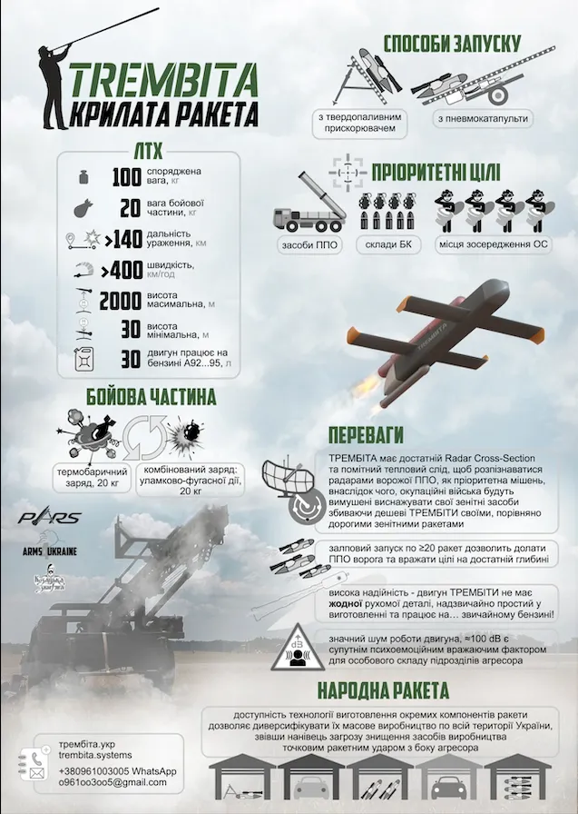 Еще одно преимущество "Трембиты" – она простая, ее можно собирать буквально в гаражах и небольших бункерах в полной децентрализации. Также "Трембите" не нужны никакие сверхсложные, сверхмассивные и дорогие платформы – она стартует с простенькой рамки или пневмокатапульты, поэтому в теории ее могут даже запускать операторы ССО в российском тылу.