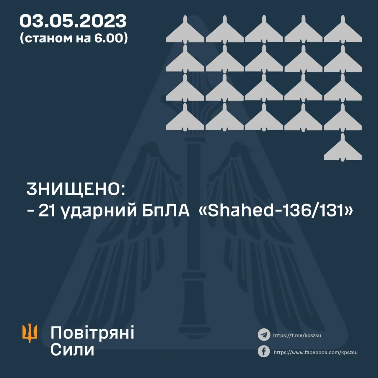 Силы ПВО уничтожили 21 "Шахид" в ночь на 3 мая / Инфографика Воздушных сил ВСУ