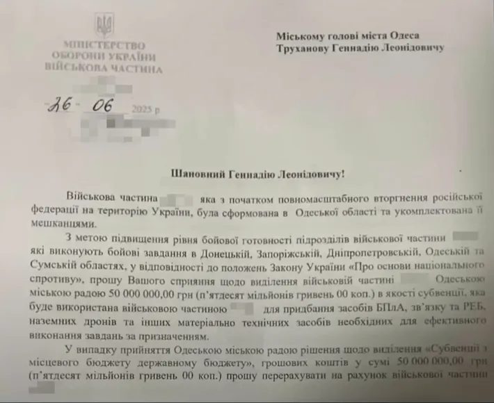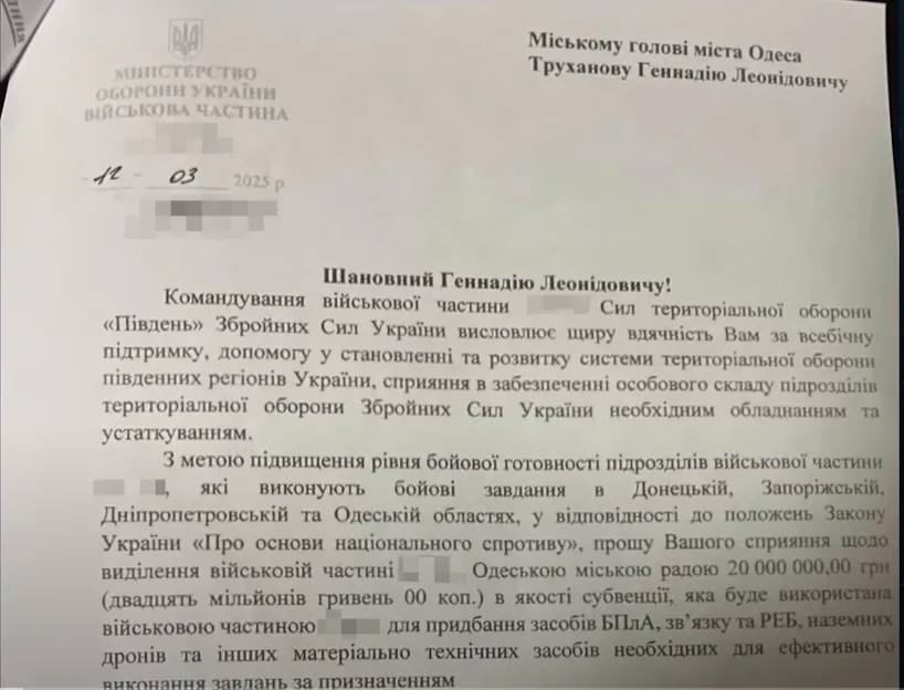 3 целью повышения уровня боевой готовности подразделений воинской части... которые выполняют боевые задачи в Донецкой, Запорожской, Днепропетровской и Одесской областях... прошу Вашего содействия по выделению Одесским городским советом 20 миллионов гривен в качестве субвенции для приобретения средств БПЛА, связи и РЭБ, наземных дронов и других материально-технических средств, необходимых для эффективного выполнения задач по назначению.