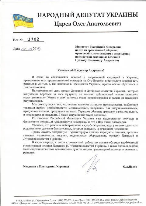 "В связи со сложившейся тяжелой и напряженной ситуацией в Украине, проведением антитеррористической операции на Юго-Востоке, в результате которой есть раненые и убитые, я, как кандидат в Президенты Украины, обращаюсь к министру МЧС Российской Федерации Пучкову Владимиру Андреевичу с просьбой оказать экстренную гуманитарную помощь Донецкой и Луганской областям Украины ", - отметил Царев.