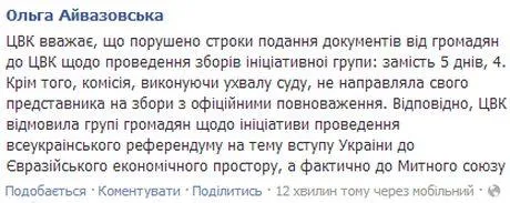 "Соответственно, ЦИК отказала группе граждан по инициативе проведения всеукраинского референдума на тему вступления Украины в Евразийское экономическое пространство, а фактически в Таможенный союз", - пишет Айвазовская.