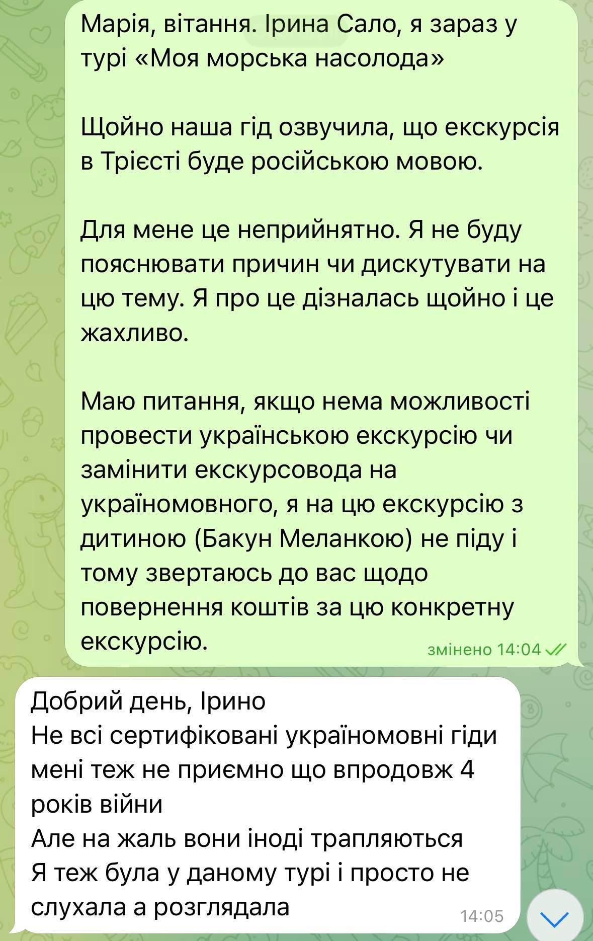 Менеджер компании в частной переписке ответила Ирине, что не все сертифицированные гиды – украиноязычные и отметила, что ей самой "неприятно" и посоветовала "не слушать экскурсию, а только рассматривать".