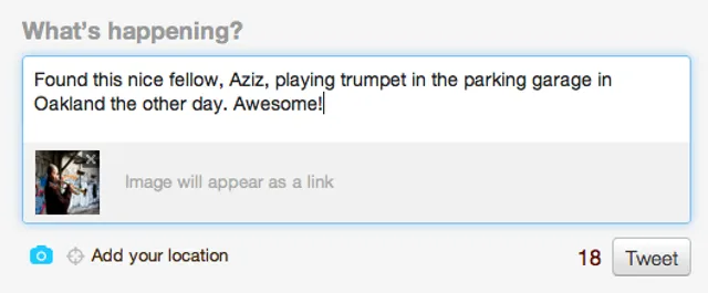 Новая функция доступна всем пользователям сайта, пишет TechCrunch. Чтобы прикрепить картинку, необходимо нажать на иконку фотоаппарата, которая появилась под текстовым полем слева. Размер фотографии не должен превышать 3 Мб. Фото отображается в виде ссылки. Клик по твиту откроет предыдущий в правой панели сайта. Для удаления уже размещенного фото, придется удалить весь твит целиком.