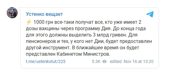 Народный депутат от фракции "Слуга народа" Алексей Устенко отметил, что деньги смогут получить лишь те, кто сделает прививку после 19 декабря (дата начала работы программы). Но позже нардеп в своем Telegram опроверг эту информацию и заявил, что деньги получат все вакцинированные.