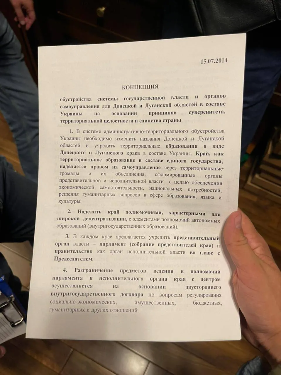 В ходе обыска у Нестора Шуфрича СБУ обнаружила документ со сформированной "концепцией" автономии Донецкой и Луганской областей в составе Украины. Документ предусматривает переименование этих областей в так называемые "края", широкие права, возможность самостоятельного проведения выборов, формирование отдельного правительства и парламента.