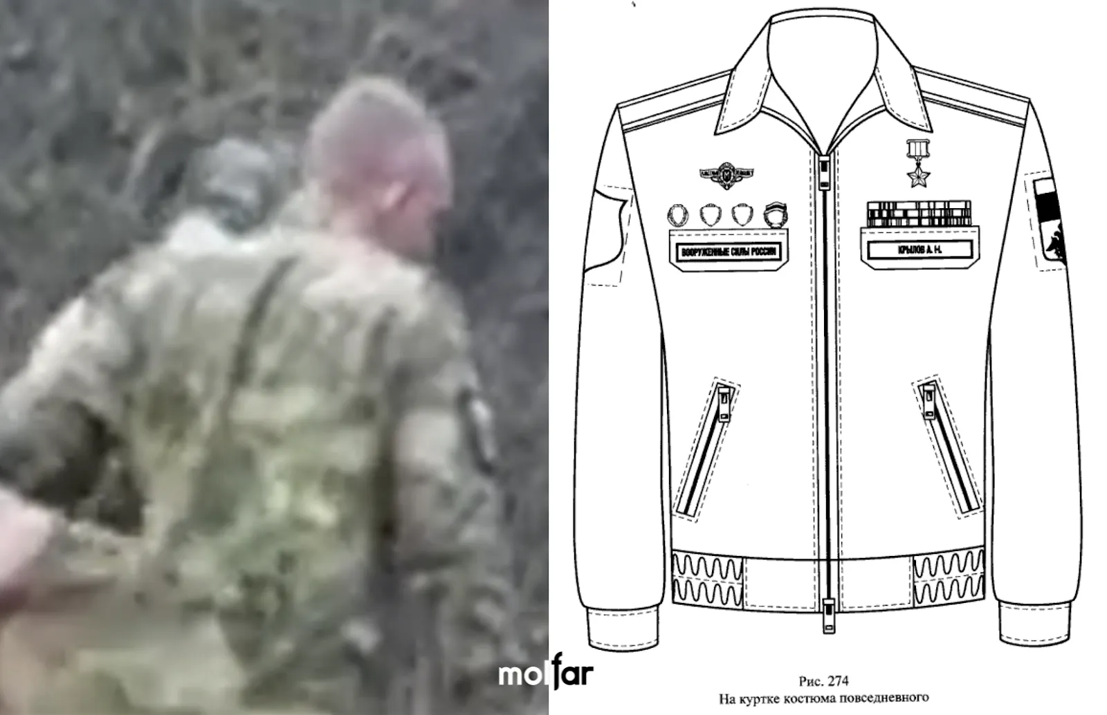Форма и расположение шеврона/нарукавного знака соответствуют установленным в армии оккупантов согласно с приказом Минобороны России от октября 2020 года. Этим самым приказом предусмотрено, что нарукавные знаки на куртках должны быть защитного цвета, знак такого цвета можно увидеть на видео. Из-за низкого качества видео не удалось установить конкретное подразделение, к которому принадлежит лицо в камуфляжной форме, однако по общим характеристикам шеврон похож на шевронов российской армии.