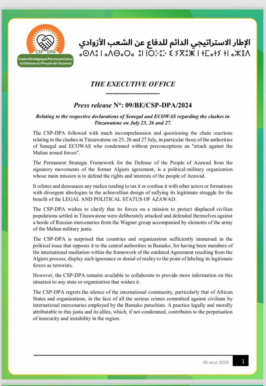 В своем заявлении спикер CSP-DPA, в частности, отмечает, что "силы "Азавада", которые выполняли миссию по защите перемещенного гражданского населения, были намеренно атакованы и защищались от орды российских наемников из группы "Вагнера" и подразделений армии малийской военной хунты".