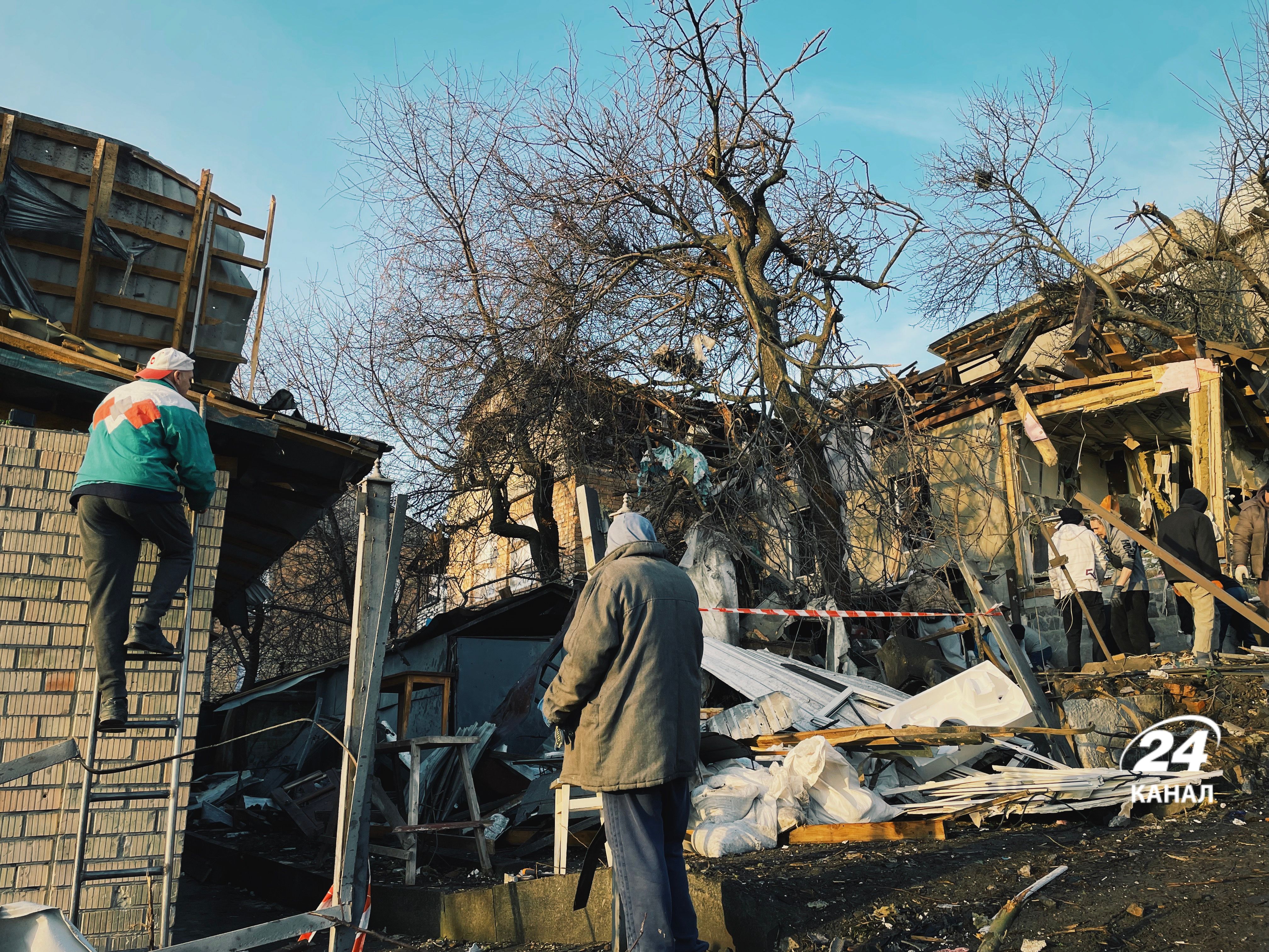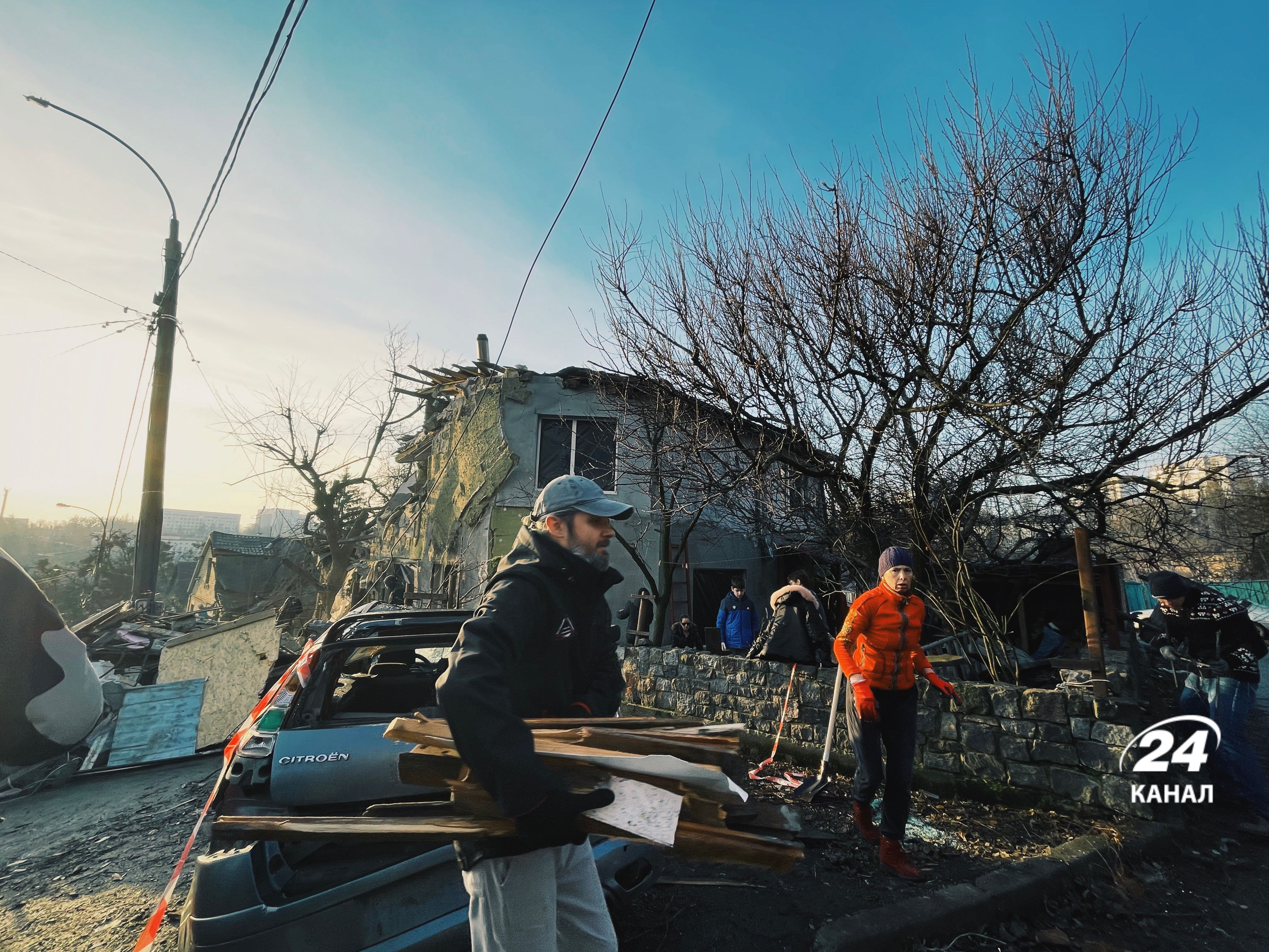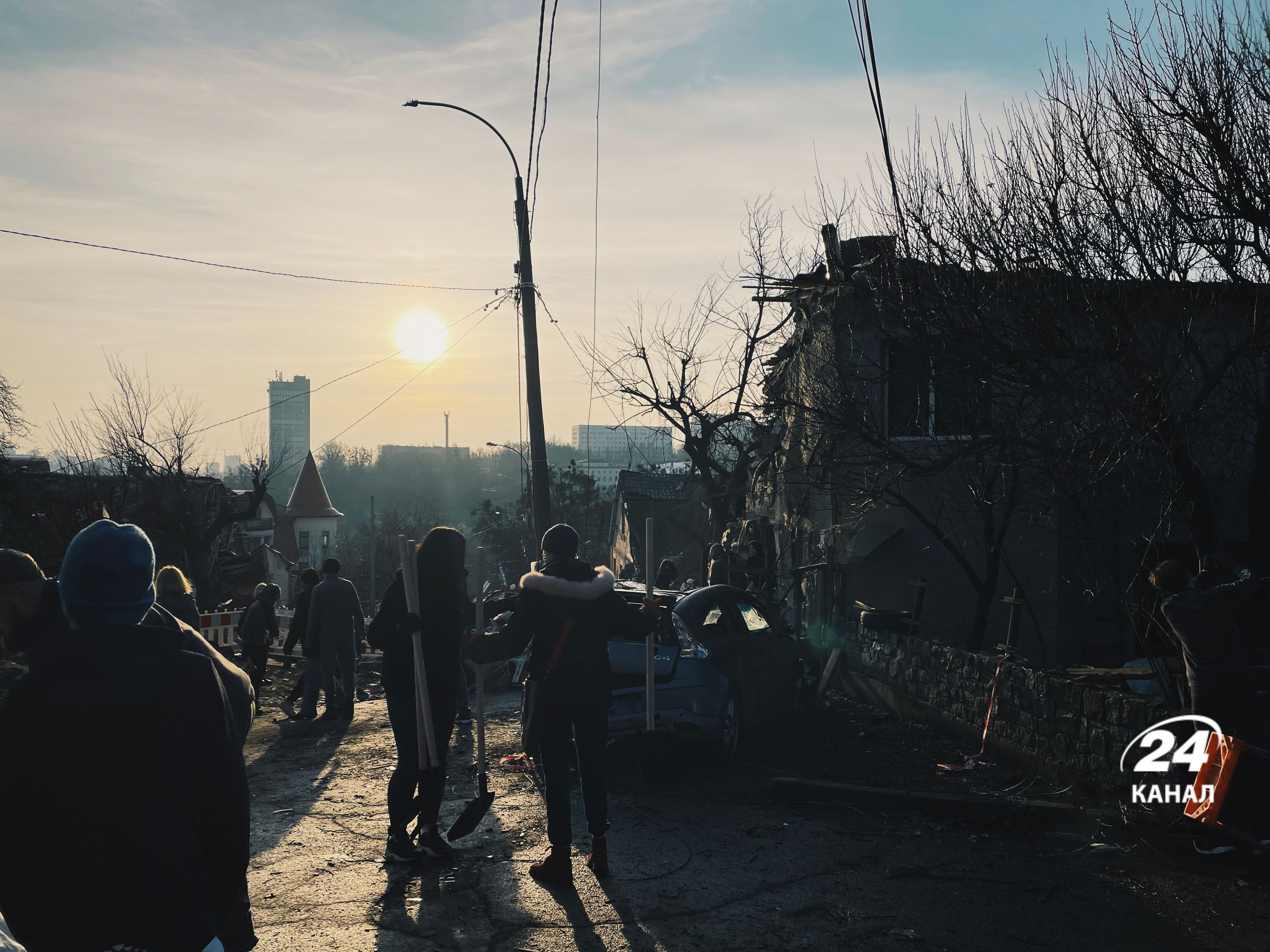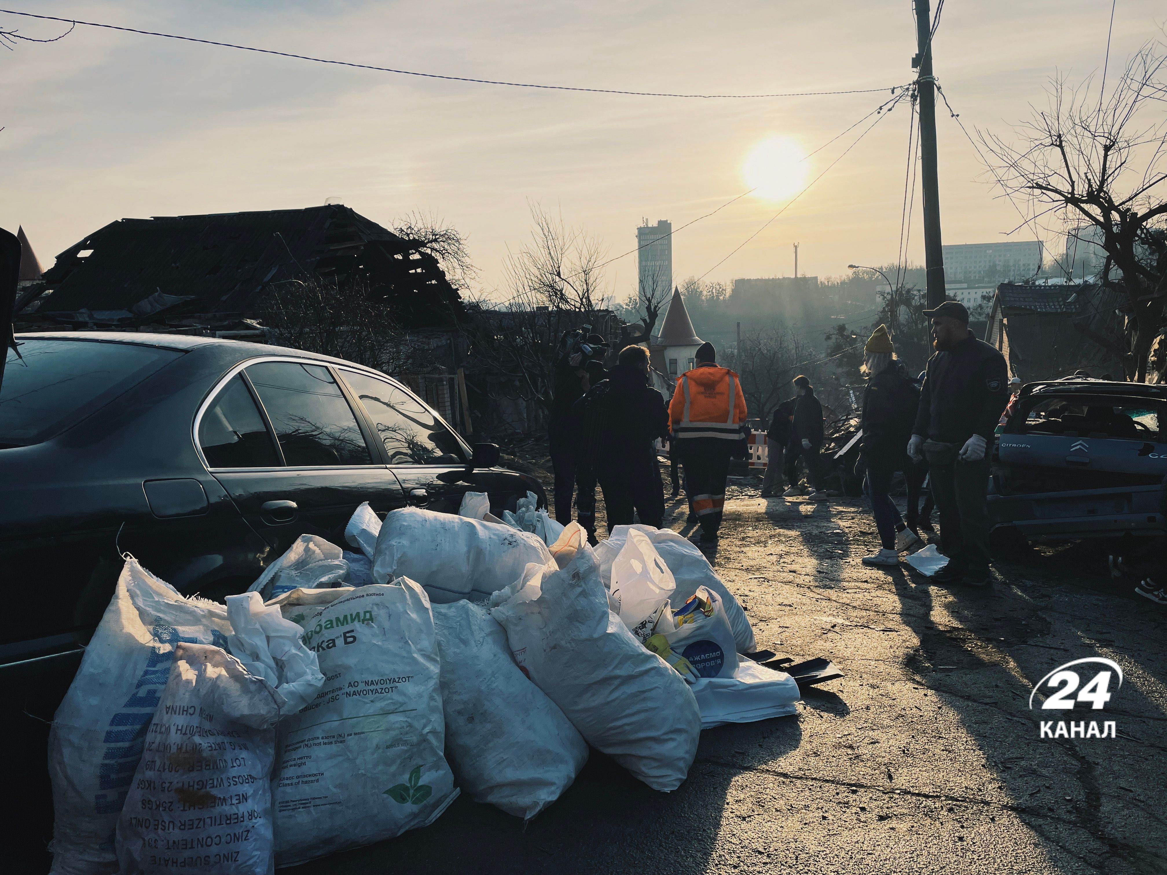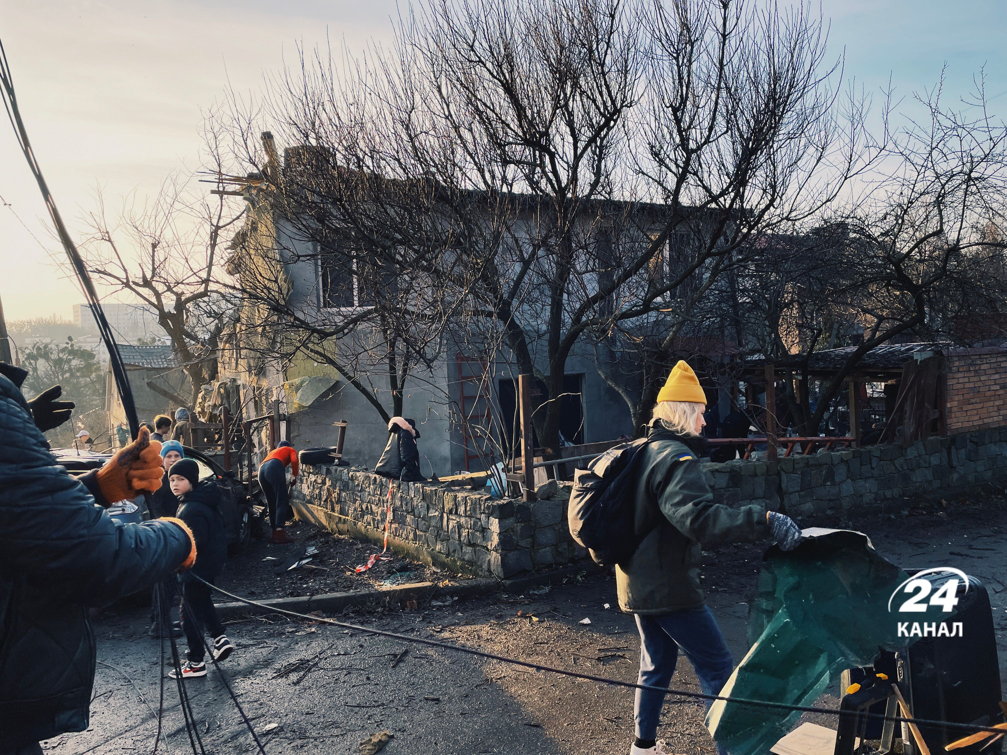 На месте попадания ракеты работы действительно много: повреждены дома, автомобили, поваленные деревья, поврежден газопровод, а рядом – огромная воронка, которую огородили забором. Присоединилось много желающих помочь: кто-то складывал мусор, кто-то загружал его в авто для вывоза, а кто-то устроил самый настоящий полевой обед для неравнодушных.