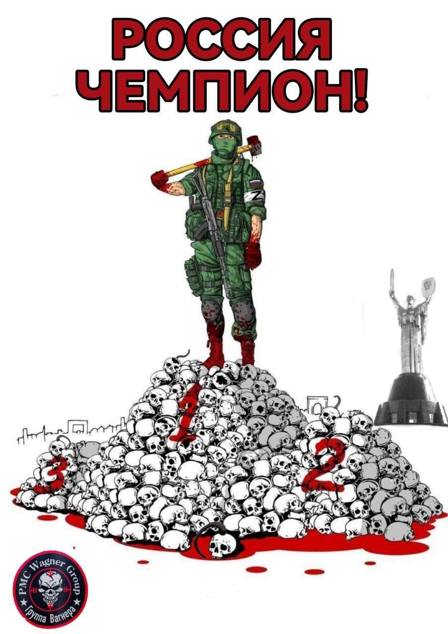 Вагнеровцы не придумали ничего лучше. Они решили украсть эту иллюстрацию, коряво обрезать ее и наклеить на нее собственную надпись. Пожалуй, у Paint. Так, иллюстрация вагнеровца-убийцы превратилась в плакат, на котором Россия, видите ли, чемпион. И вагнеровцы очень гордятся тем, что убивают как украинских защитников, так и мирное население.